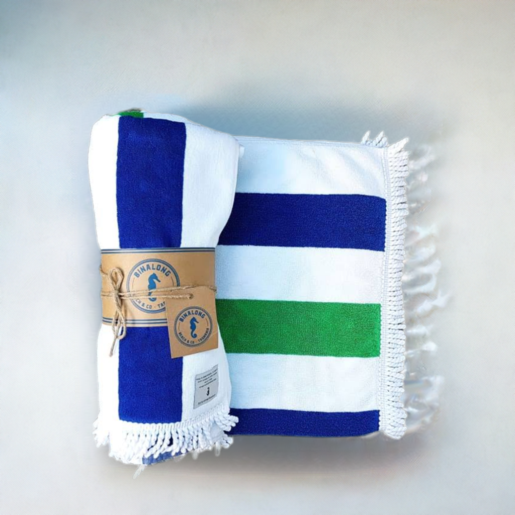 Named after the picturesque town at the southernmost end of the Bay of Fires in Tasmania, Binalong Bay is known for its beautiful, rugged stretches of teal blue water and sugar white sand. This towel features the classic broad nautical stripe that is universally associated with "holiday" and "summer". It is 100% cotton and the ultimate in luxury. Beautifully thick and absorbent with a dense pile, this towel comes out softer and fluffier after every wash. Its classic blue broad stripe pattern features:
