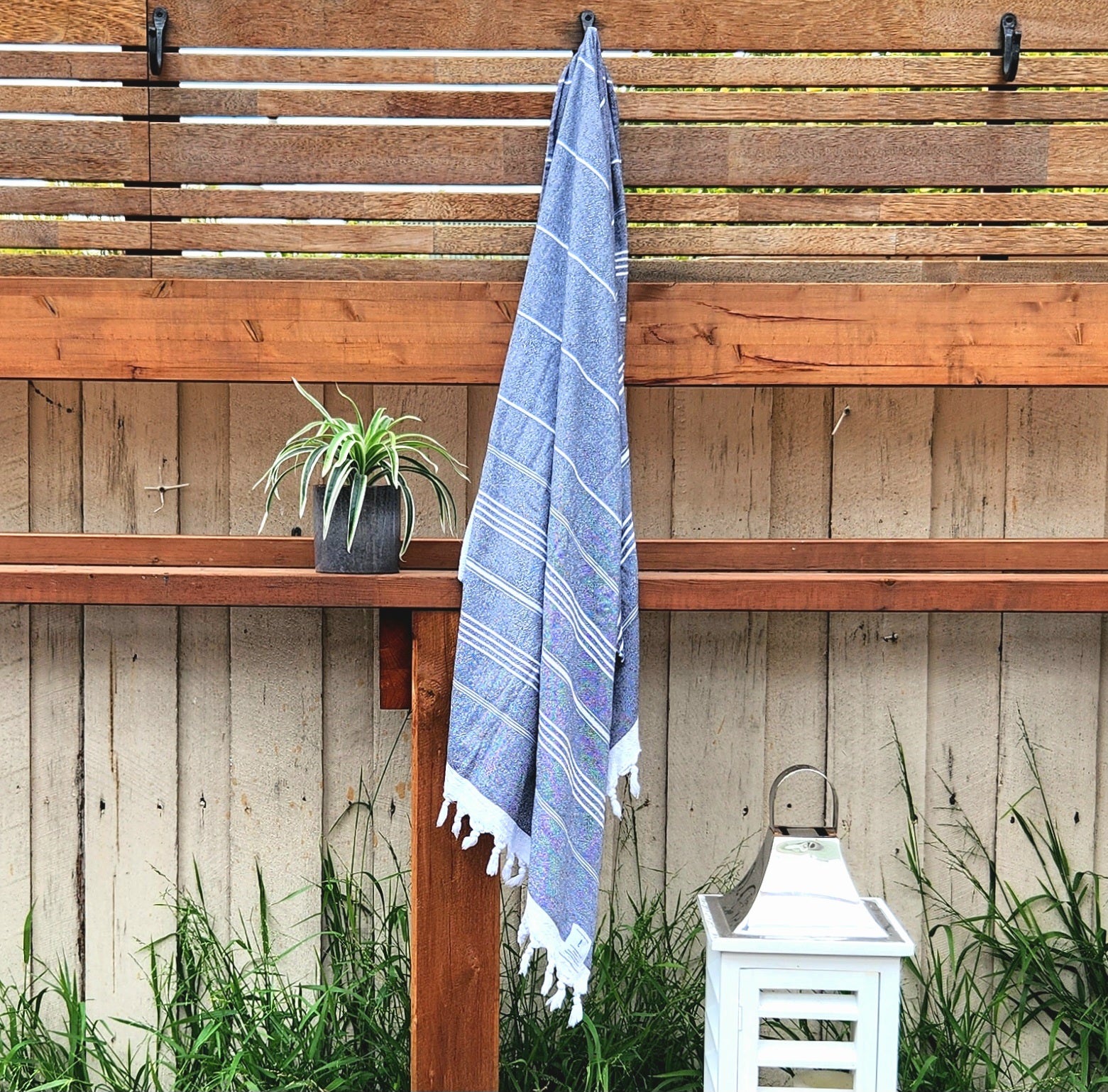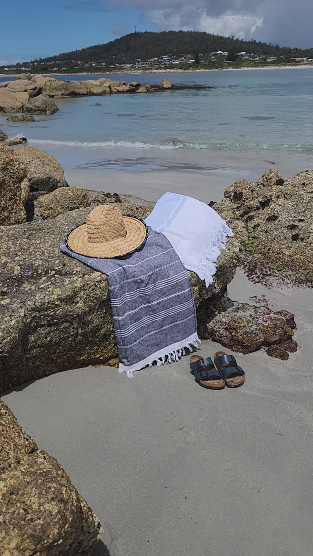 Woven in the tradition of fine Turkish towels, our unique Binalong Beach & CO towel is perfect for travel. This version of the fouta towel is made in Turkey by local artisans and combines looped cotton terry on one side with smooth cotton on the other. The stripes and tassels bring a sense of style to the beach, pool or bath. This towel will become softer and more absorbent with each wash. Lighter than our cabana towels, it's just the perfect weight to bring along in your suitcase.
