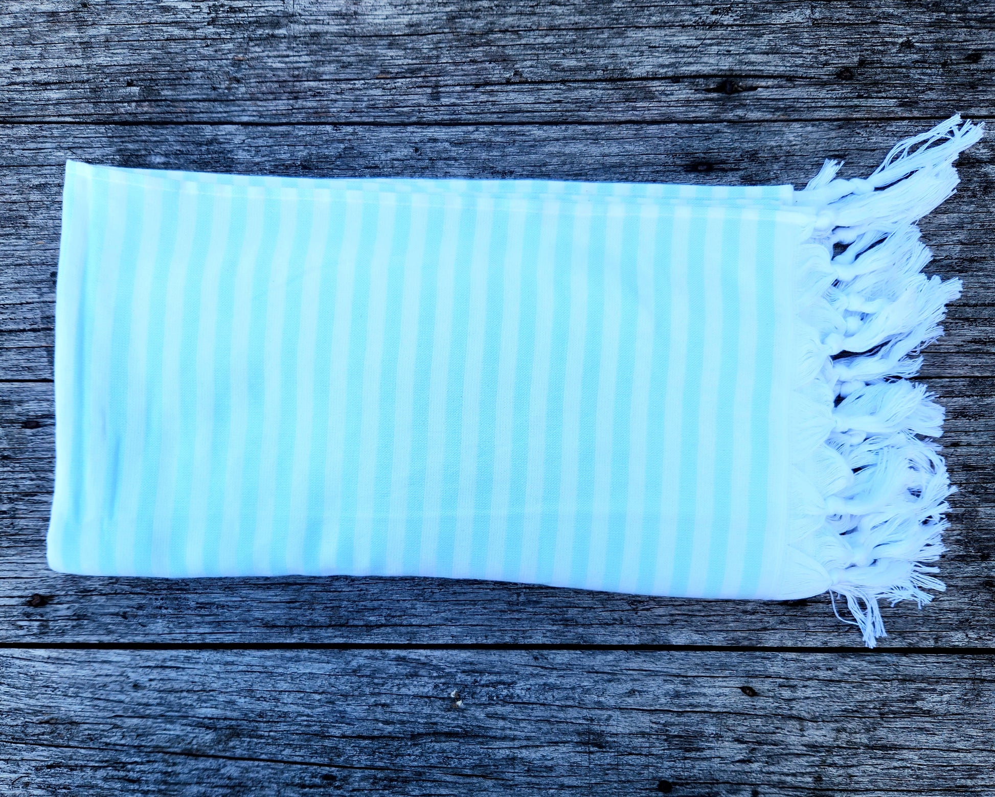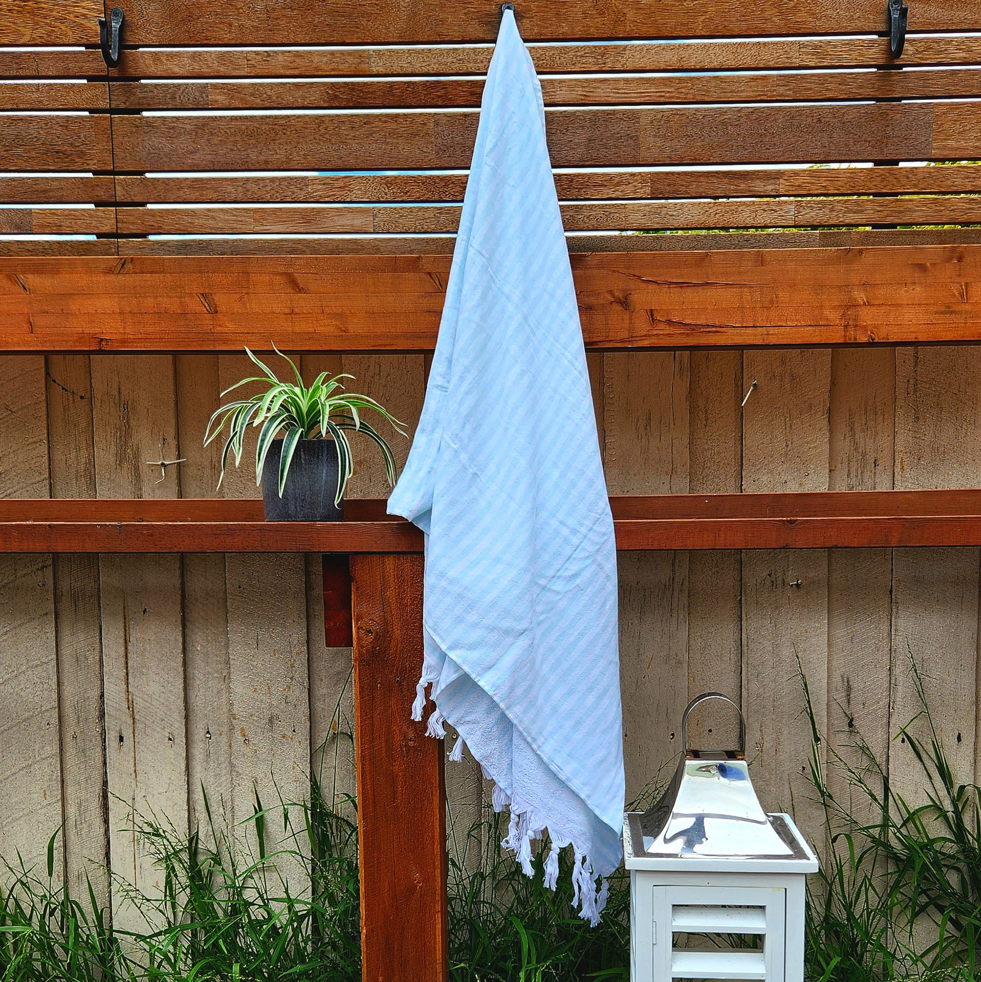 Woven in the tradition of fine Turkish towels, our unique Binalong Beach & CO towel is perfect for travel. Our version of the fouta towel is made in Turkey by local artisans and combines looped cotton terry on one side with smooth cotton on the other. The stripes and tassels bring a sense of style to the beach, pool or bath. This towel will become softer and more absorbent with each wash. Lighter than our cabana towels, it's just the perfect weight to bring along in your suitcase.